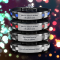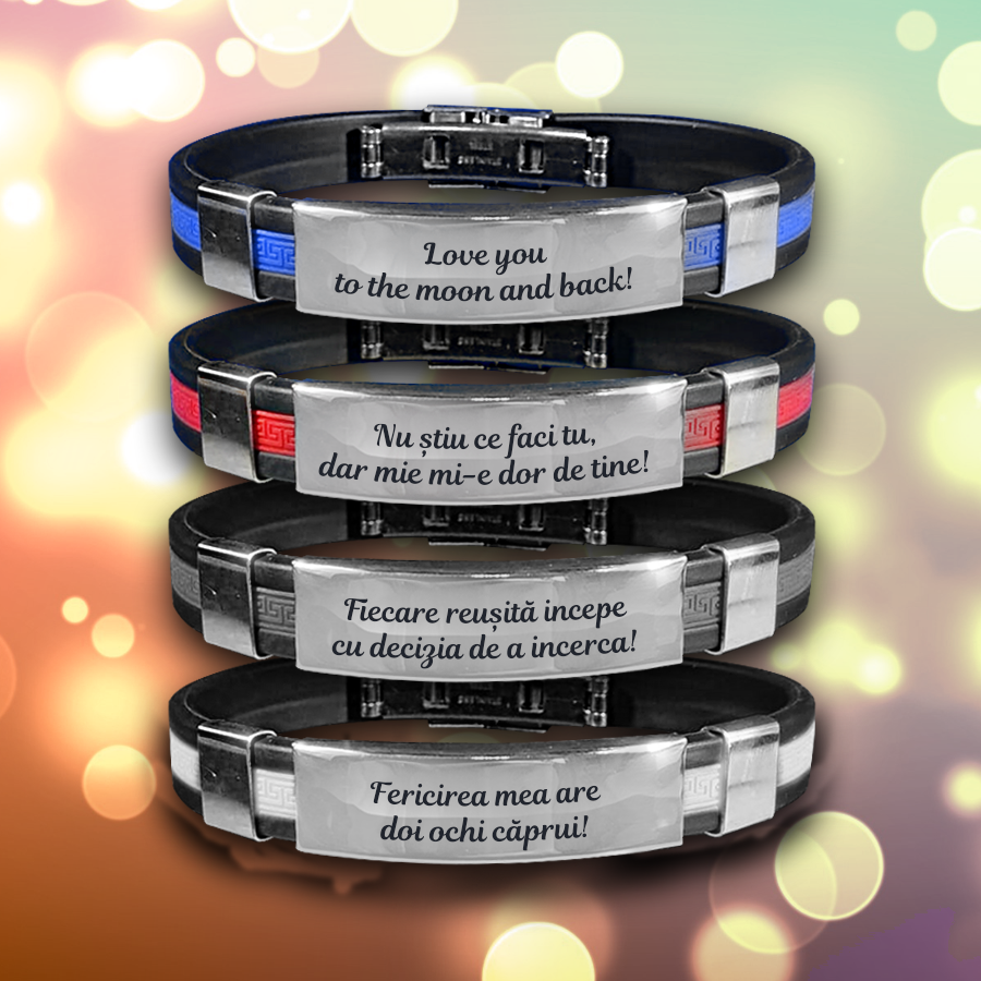 Bratara din material textil cu placuta din inox inoxidabil. Placuta de inox de pe bratara are o forma usor curbata ca sa se plieze mai confortabil pe maina. Marimea placutei este 12x43 mm ce poate fi gravata cu text personalizat. Catarama de inchidere la fel este din inox ce are o dubla inchidere.