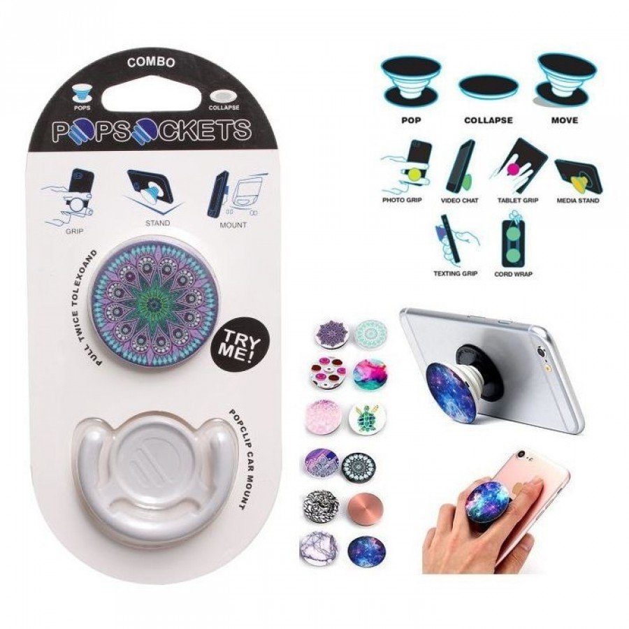 Suportul de telefon tip popsocket este un accesoriu util in folosirea telefonului sau tabletei. Poate fi folosit in mai multe feluri, pentru a tine telefonul cat mai bine in maina, ca si suport al telefonului pe masa, sau ca suport pe bordul autorismului. Produsul are 2 corpuri, unul se lipeste de spatele telefonului, celalt poate fi lipit pe o alta suprafata de care va fi atasat telefonul. Produsul este din plastic usor cu un design atractiv.